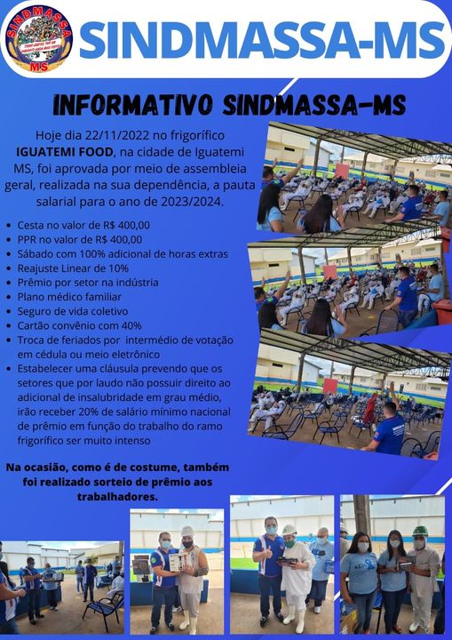 Informativo da Assembleia6 de dez. de 20221 min de leituraInformativo da Assembleia realizada hoje (22/11), no Frigorífico Iguatemi Food, com as respectivas pautas aprovadas.